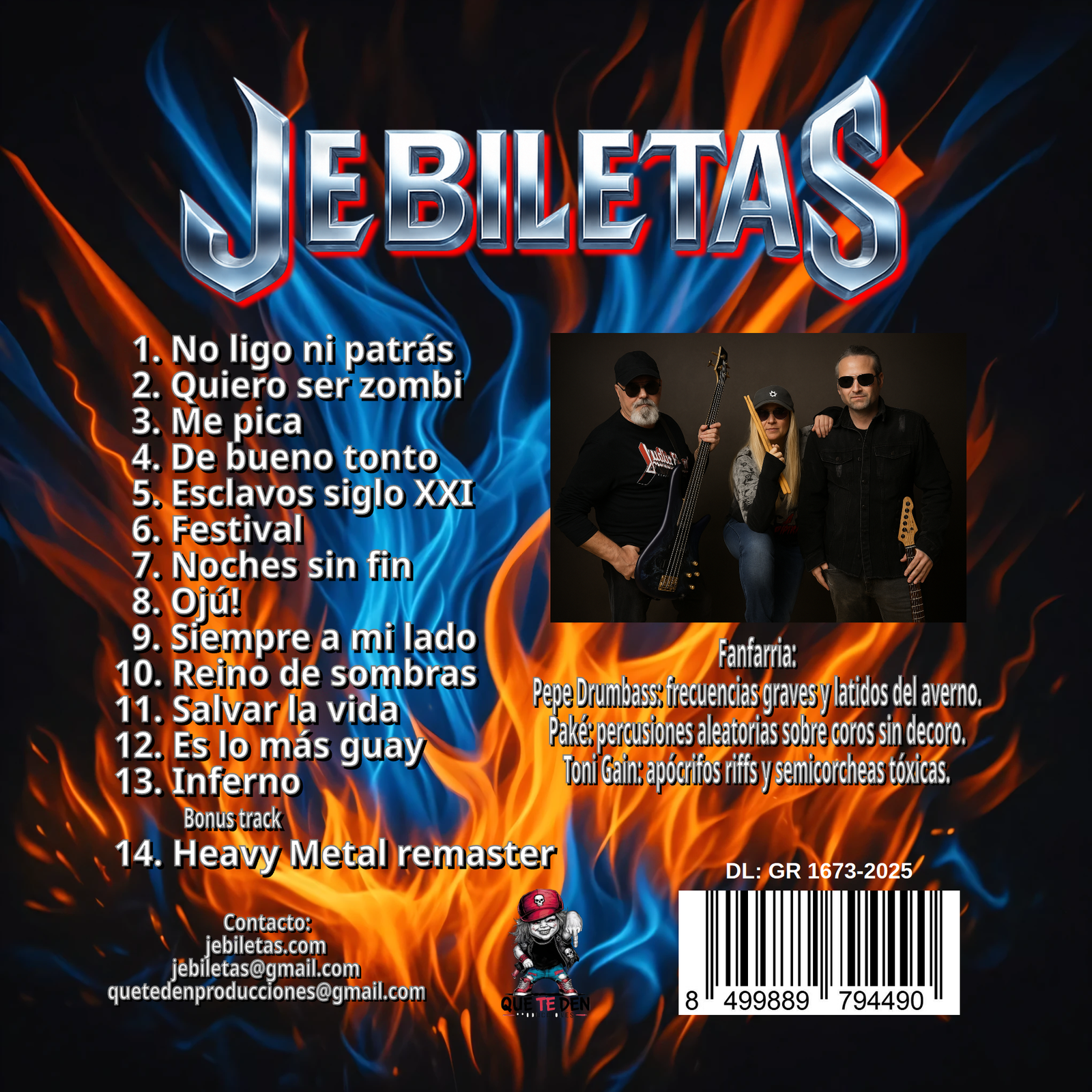 Prepárate para subir el volumen: “El Poder del Jebimetal Ibérico” es el CD definitivo para los amantes del metal con identidad propia. Este álbum reúne riffs contundentes, ritmos pegadizos y letras cargadas de energía que combinan lo mejor del metal con la esencia cultural ibérica. Cada tema está pensado para hacerte mover la cabeza, reír, cantar y sentir esa fuerza tan característica del Jebimetal.